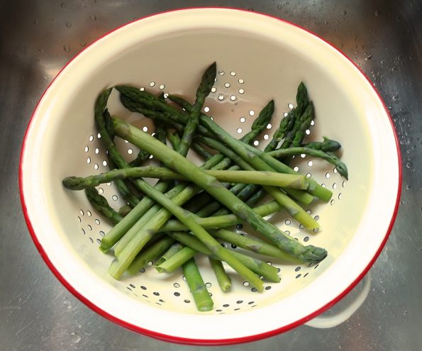 - Drain the cooked asparagus into a colander and then spread it out on a board to help it cool down quicker. *Depending on the size of the pan you may need to cook them in two batches.