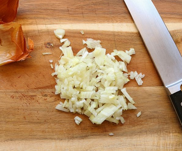 Place the butter in a medium-sized saucepan and over a medium/low heat cook the onions, stirring often for 3 minutes or until they’ve softened. (Whilst they are cooking get a whisk ready.)