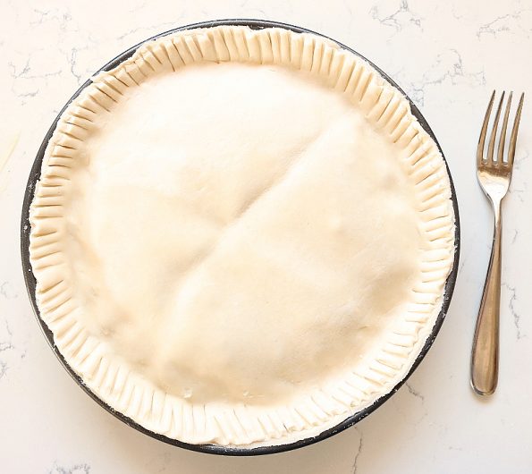 Depending on the size of your dish, it may lay flat or like this one, can be slightly tucked in around the filling so that the edges of the bottom and the top pastry match perfectly (which will look nicer).