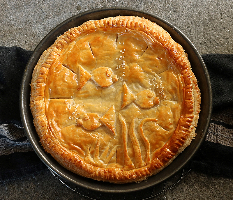 I’ll add Mum’s pie one day but I’m a pastry lover and a lover of salt…(help me) so I’ve made this salty, bacon & smoked fish pie, encased in golden puff pastry…with “baby sharks…do do do do do do” on top.